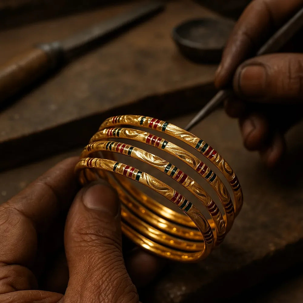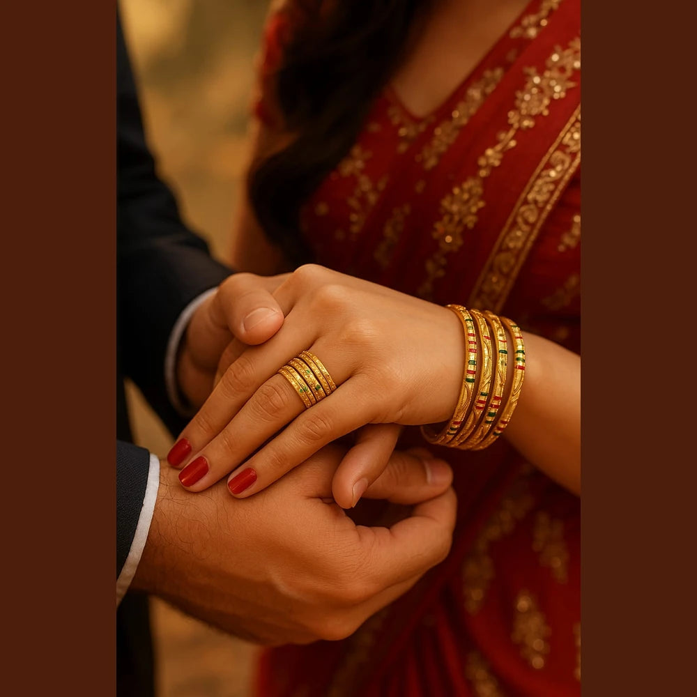 Bring home this elegant Hath Kangan Chudi set, crafted in a rich gold-tone finish with timeless red and green detailing. Each slim 2mm bangle is handmade, giving it a beautiful, artisanal feel that pairs perfectly with sarees, suits, and lehengas.