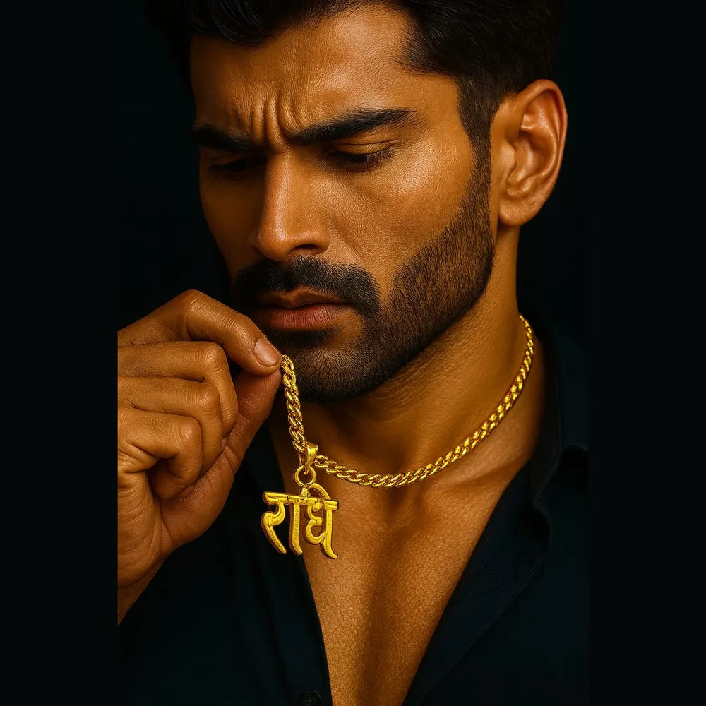 Experience devotion and style together with our Radhe Naam Gold-Plated Locket & Chain, crafted with premium copper-based metal and finished with a durable five-milligram gold plating.